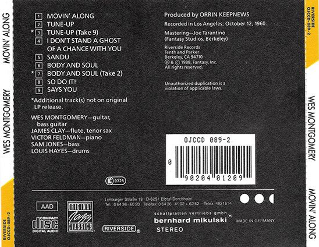 Wes Montgomery ‎– Movin' Along Audio CD